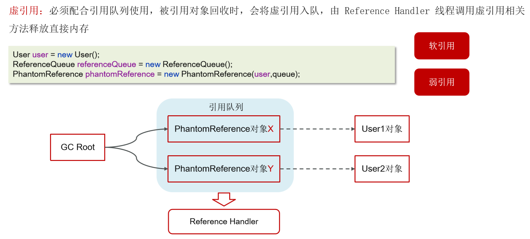 虚引用与软引用和弱引用的一个区别在于:虚引用必须和引用队列(ReferenceQueue)联合使用。当垃圾回收器准备回收一个对象时,如果发现它还有虚引用,就会在回收对象的内存之前,把这个虚引用加入到与之关联的引用队列中。程序可以通过判断引用队列中是否已经加入了虚引用,来了解被引用的对象是否将要被垃圾回收。程序如果发现某个虚引用已经被加入到引用队列,那么就可以在所引用的对象的内存被回收之前采取必要的行动。
