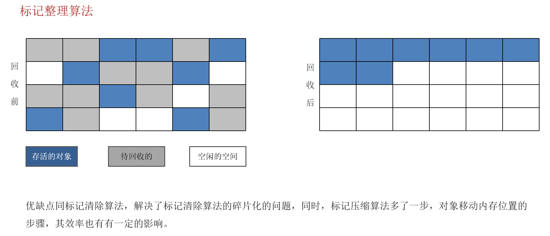优缺点同标记清除算法,解决了标记清除算法的碎片化的问题,同时标记压缩算法多了一步,对象移动内存位置的步骤,其效率也有有一定的影响。