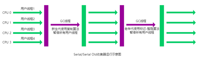 Serial和Serial Old串行垃圾收集器,是指使用单线程进行垃圾回收,堆内存较小,适合个人电脑