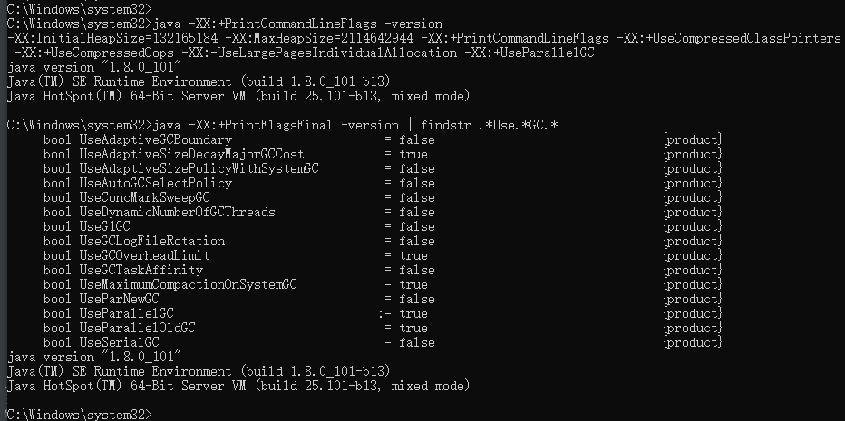 java -XX:+PrintFlagsFinal -version | findstr .*Use.*GC.* #Windows系统