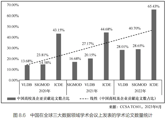 在学术领域,我国更是势不可挡,在全球三大数据库领域学术会议的影响力日益提升,中国高校及企业在三大会议中的每年贡献占比平均为 23.81%、27.17% 和 40.70%,逐年上升。