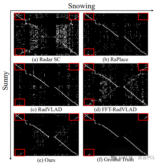图6。嵌入距离矩阵由查询(晴天序列)与来自地图的候选(雪天序列)之间的最近距离构成。GT是两个姿态的实际位置之间的距离,Radar SC是余弦距离,RaPlace是互相关和自相关,而RadVLAD、FFT-RadVLAD和我们的方法则使用L2距离。距离矩阵中每个描述符的值表示与其各自距离的最近嵌入距离的索引为1,其余为0。