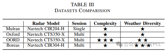 为了全面验证所提出的方法,我们选择了三种安装了不同雷达模型的数据集,如表III所示。此外在所有数据集中,在20米的位置密度下,将描述符与其他描述子进行了比较。下面提供了更详细的数据集信息。