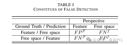 将自由空间误认为特征从特征提取的角度来看是一个假阳性,但从提取自由空间的角度来看则是一个假阴性。反之,将特征识别为自由空间从特征提取的角度来看是一个假阴性,但从提取自由空间的角度来看则是一个假阳性。这种相互关系可以用公式表示,其中上标F和f分别代表特征和自由空间,符号#表示数量。这种互惠关系表明,从自由空间角度来看,错误检测的数量等于从特征角度解读的错误检测数量。错误检测对描述的影响可以通过错误检测率进行数值计算,即假检测数量(#False)除以特征数量(#Feature)或自由空间数量(#Free space)。如表II所示,自由空间的数量显著大于特征的数量,这意味着在单个雷达图像中,自由空间的错误检测率相对低于特征的错误检测率。这显著有助于减轻误分类的影响。