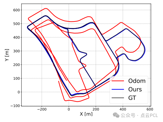 图7. 展示了Mulran的KAIST序列中里程计、优化后的姿态和真实轨迹的定性结果对比。