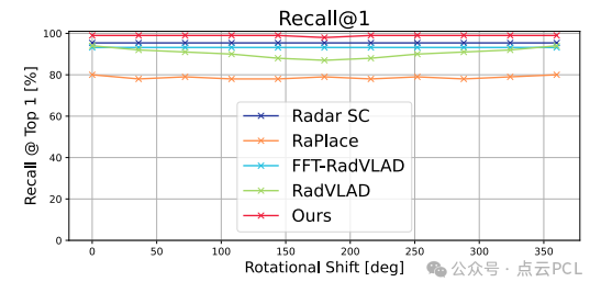 旋转不变性:由于雷达图像包含半度量信息,移动一列意味着角度的变化。因此,我们分析了在移动查询雷达图像的列时,候选雷达图像的一致性,以检查旋转不变性。图4展示了我们方法的旋转不变性。只有Radar SC、FFT-RadVLAD和我们的方法保持一致的性能。我们的方法中可以检查到微小的变化,因为在特征提取步骤中,内核区域在移动时略有不同。此外,无法通过FFT获得旋转不变性的RadVLAD表现不一致,而RaPlace的拉东变换处理也干扰了一致性。