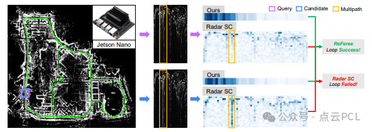 图1. 所提出的位置识别成功地在充满多径和散斑噪声的雷达图像中识别出正确的回环,相比之下,毫米波雷达SC对多径现象表现出脆弱性,常常导致错误回环的识别。此外轻量描述符子42×1形状能够在KAIST序列的Mulran数据集上,使用Nvidia Jetson Nano执行SLAM。