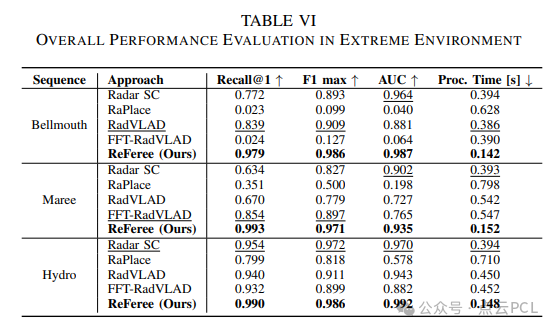 整体性能:为了评估在极端环境中自由空间的性能,我们利用了OORD数据集。与依赖结构的其他方法不同,所提方法取得了显著的结果。特别是处理时间与前一部分的RadVLAD和FFT-RadVLAD相似,几乎快了3倍。表VI显示,自由空间能够在特征稀缺的极端环境中稳健地描述位置。我们还在称为Oxford Radar Robotcar的数据集中验证了该方法。