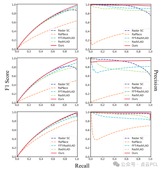 PR曲线和F1-召回曲线:在极端环境中,来自结构信息的特征稀疏性使得通过几何验证进行准确的循环验证变得具有挑战性。图5中的PR曲线表明,所提方法在召回率增加时保持高精度,表明它有效区分真实的循环。图5和表VI中的F1召回曲线展示了区分循环的能力,并表明我们的描述符能够检测到许多循环。