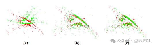 图3。查询点云(红色)和候选点云(绿色)分别在DCC 01的1492帧和1041帧中。(a)未估计初始航向的点云。(b)在转换源点云时应用初始航向后。(c)在(b)状态下通过ICP优化后的可视化结果。