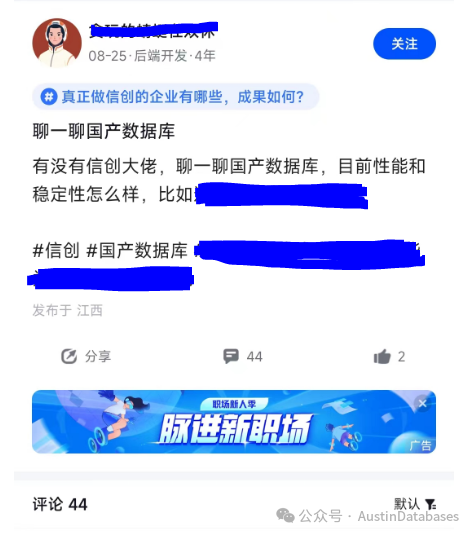 最近在脉脉APP上,总能发现国产数据库的话题,可能因为脉脉上标注我是数据库从业者,经常有一些数据库的话题推送给我,最近一段已经收到两条被标注为热点的话题推送,就算不是热门话题讨论也都挺热闹的,咱们随便挑其中有一条。话题的内容是,聊一聊国产数据库,在44回复中,有很多有意思的回复。