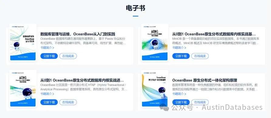 对于OceanBase的学习,从OceanBase透露出来的一些系列学习通道也是顺畅的,比如登录到 https://open.oceanbase.com/learning ,从电子书到综合系列的各种教学视频,再到各种公司使用的案例,基本上要学OB资源是不愁的,剩下的就看诸位的能不能耐下心性,搞一搞“部署量第一数据库”的知识学习了。