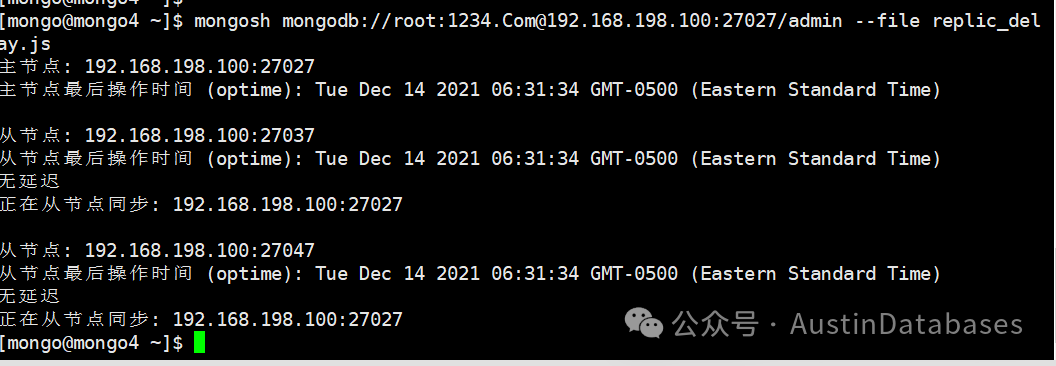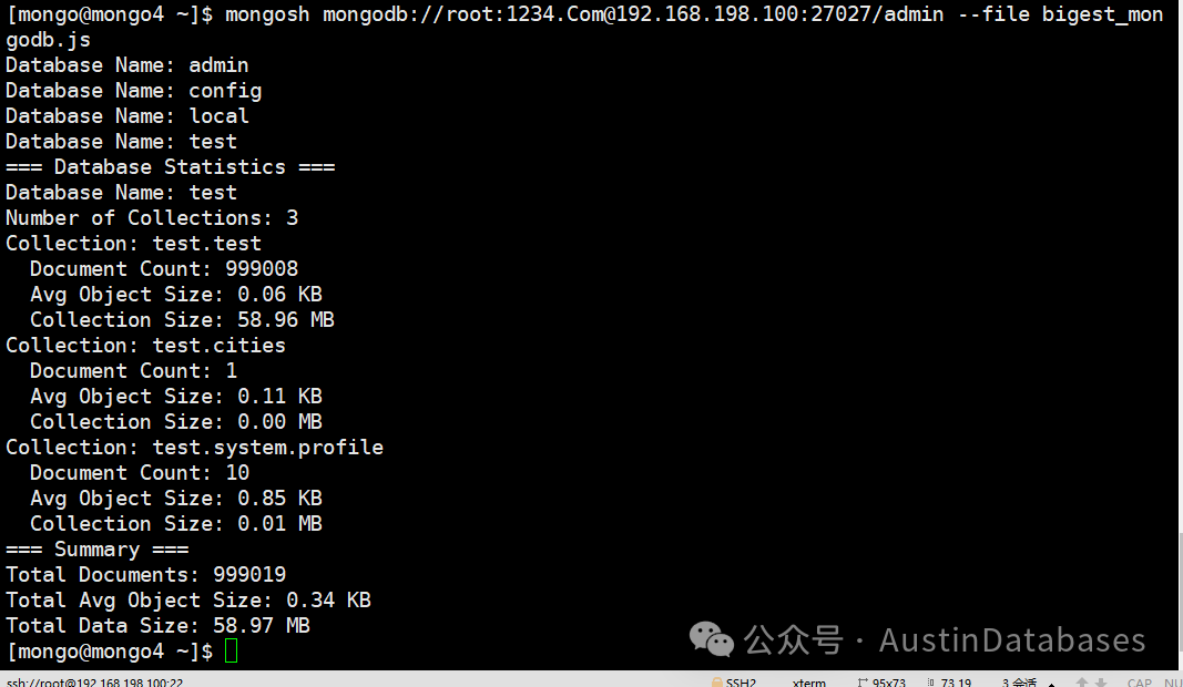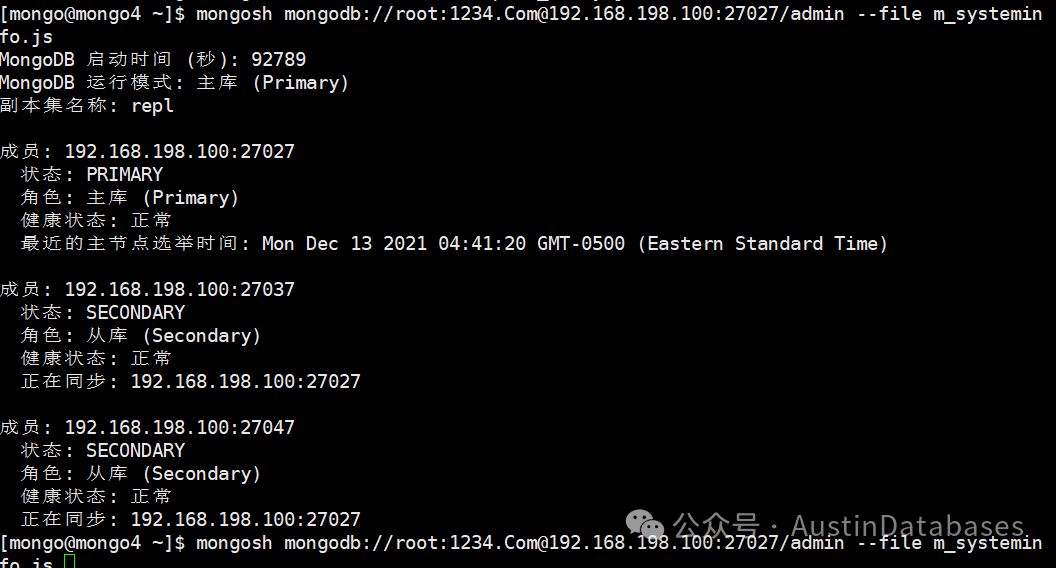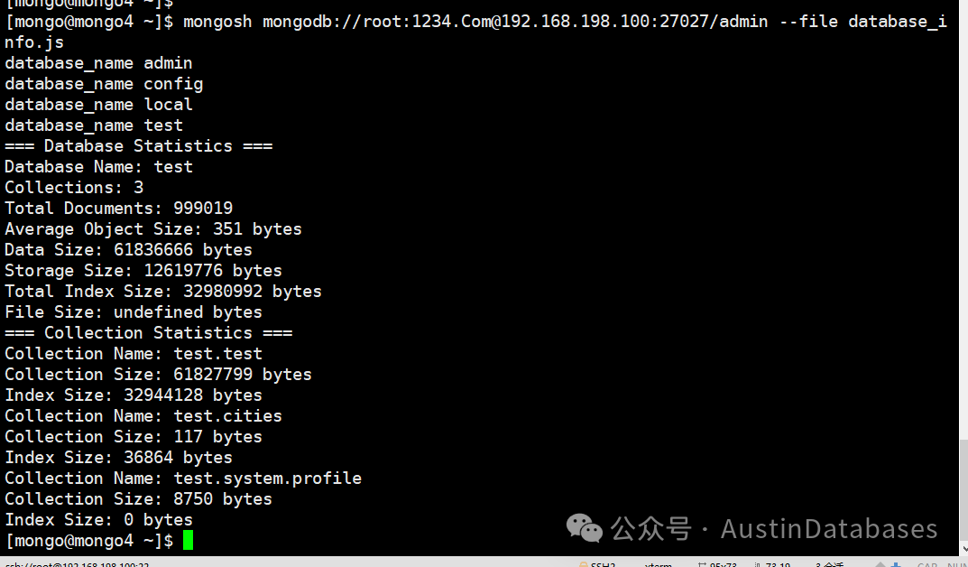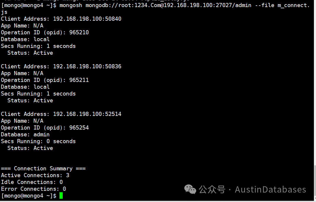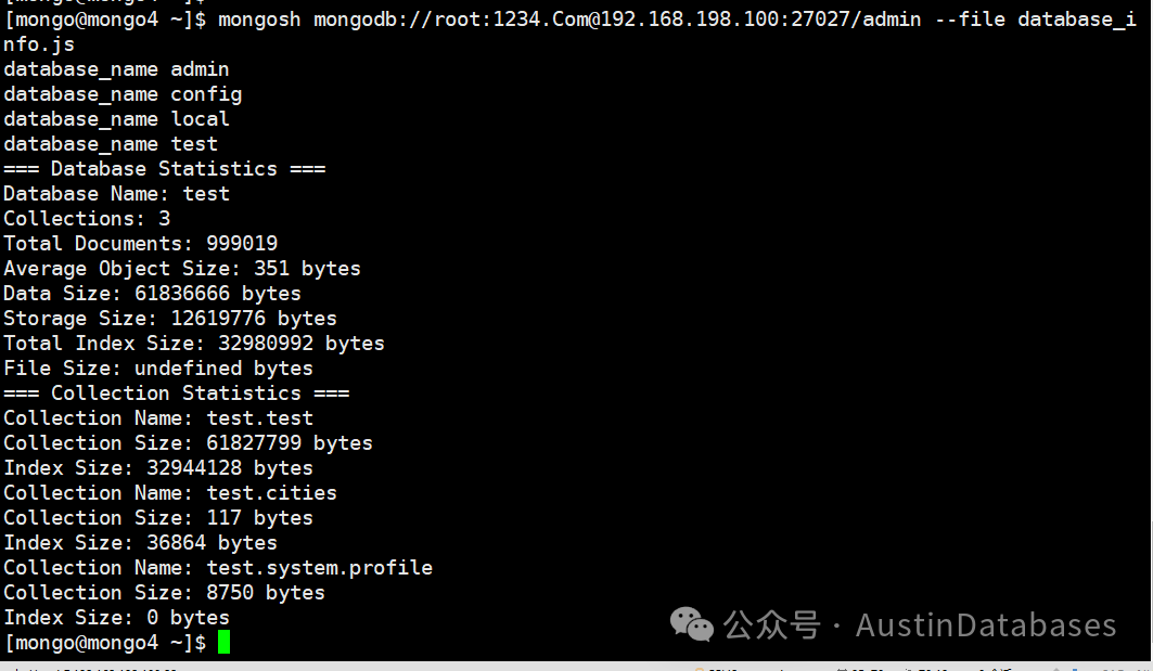 这里注意,在链接得时候,你要有足够的权限,权限不够脚本运行不了,尤其是一些管理信息类的命令,你要是怕权限不够,可以直接用mongodb 的root权限账号来运行,这里注意 db = connect('mongodb://root:1234.Com@192.168.198.100:27027/admin') 每个脚本里面都有连接的信息,其中root是账号名,1234.Com 是密码,你可以将对应你的monogDB库的用户名密码替换即可,同时后面是IP和端口号 admin指的是admin库,下面是代码和每个代码运行后的结果图。