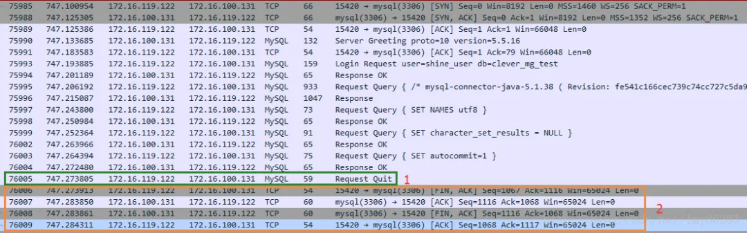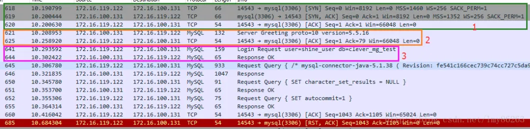 在本文的测试中,只用了5行代码来建立连接,但是并没有通过该连接去执行任何操作,所以在程序执行完毕之后,连接不是通过Connection.close()关闭的,而是由于程序执行完毕,导致进程终止,造成与数据库的连接异常关闭,所以最后会出现TCP的RST报文。在这个最简单的代码中,没有设置任何额外的连接属性,所以在设置属性上占用的时间可以认为是最少的(其实,虽然我们没有设置任何属性,但是驱动仍然设置了字符集、事务自动提交等,这取决于具体的驱动实现),所以整个连接所使用的时间可以认为是最少的。但从统计信息中可以看出,在不包括最后TCP的RST报文时(因为该报文不需要服务器返回任何响应),但是其中仍需在客户端和服务器之间进行往返7次,也就是说完成一次连接,可以认为,数据在客户端和服务器之间需要至少往返7次,从时间上来看,从开始TCP的三次握手,到最终连接强制断开为止(不包括最后的RST报文),总共花费了: