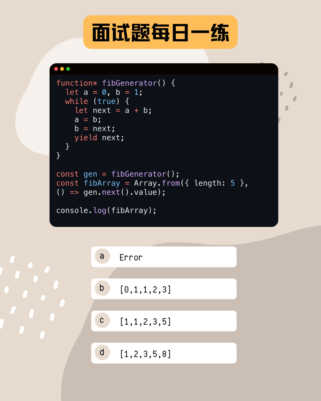 今天的挑战题目涉及到JavaScript中的生成器函数 (Generator) 和 Array.from 方法的结合使用。我们将利用生成器生成斐波那契数列,并通过 Array.from 创建一个包含前几个斐波那契数的数组。让我们一步步解析这段代码,看看它会输出什么以及为什么。