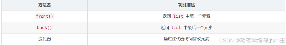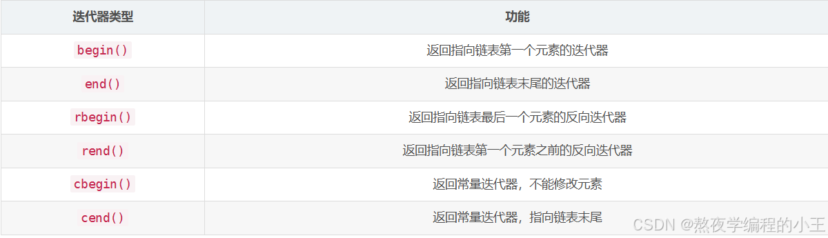 begin():指向列表的第一个元素。end():指向列表最后一个元素的下一个位置(即尾后迭代器)。rbegin() 和 rend():反向迭代器,分别指向最后一个元素和首元素的下一个位置。