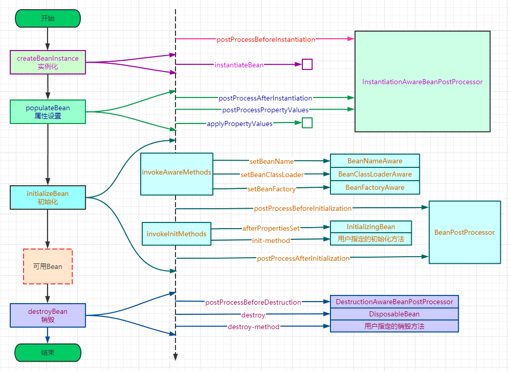 在每一步,Spring都提供的接口以方便对不同步骤的Bean进行处理,常见的接口有:InstantiationAwareBeanPostProcessor、BeanNameAware、BeanPostProcessor、InitializingBean、DisposableBean,其详细情况如下图