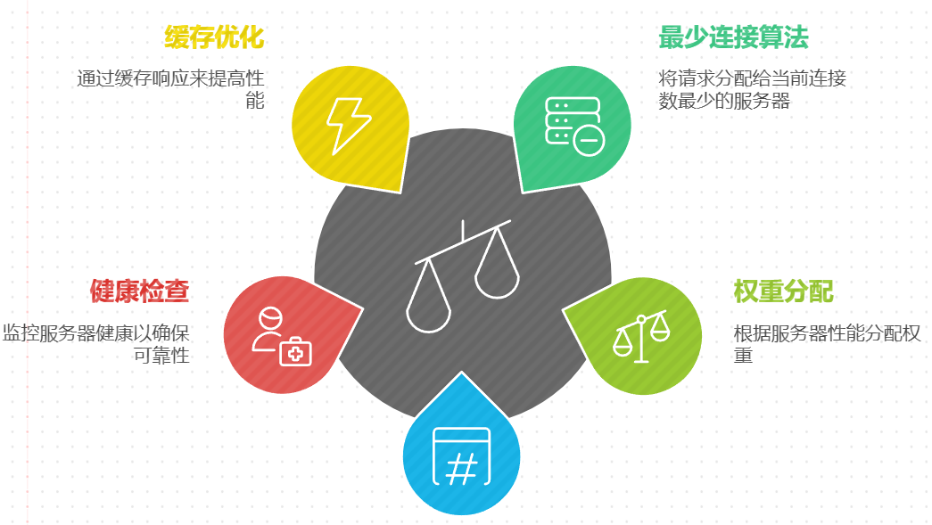 权重分配 | 根据服务器性能设置权重,高性能服务器处理更多请求。 |