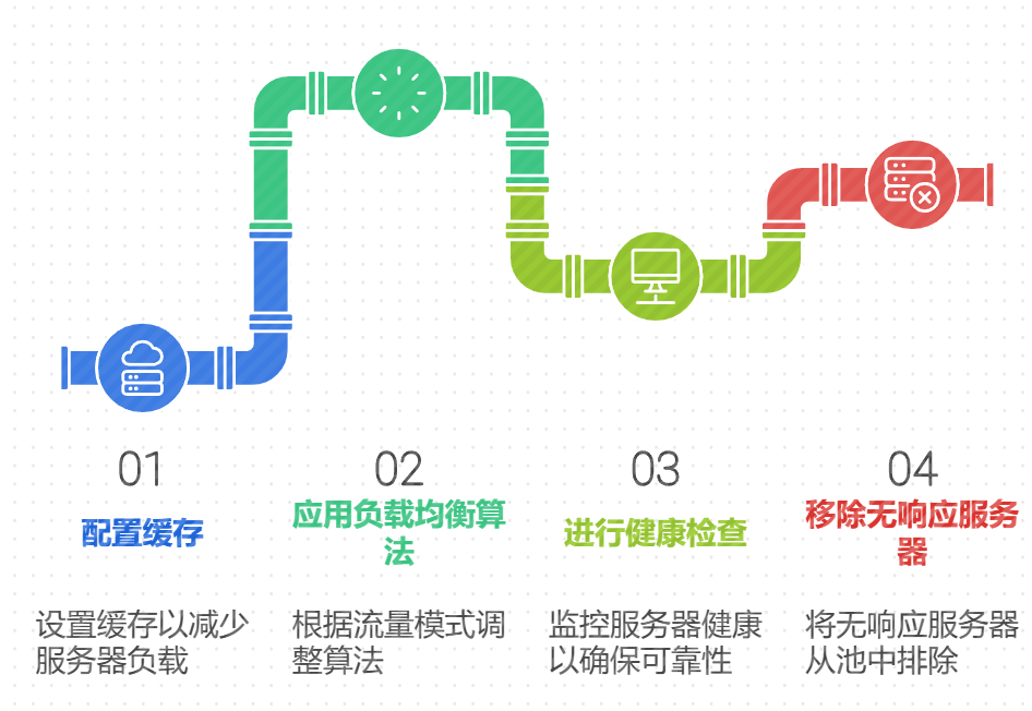 502 Bad Gateway | 后端服务不可用 | 启用健康检查,剔除故障服务器并检查服务运行状态。 |