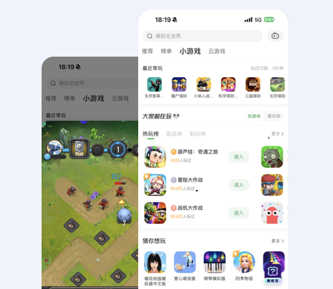可以在 App 内快速引入并上架多款小游戏,多个类型和互动方式的小游戏一站式运营,用户无需下载,即玩即走,低成本快速打造综合游戏平台。