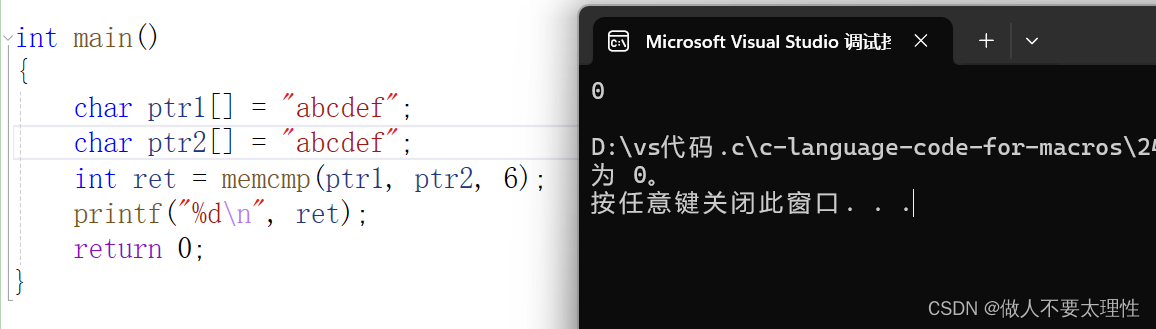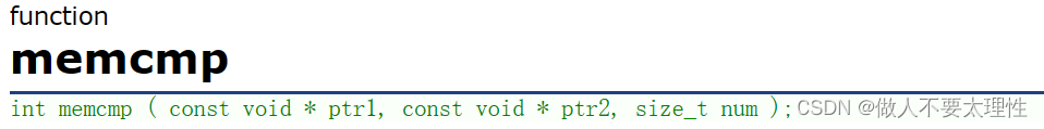 https://legacy.cplusplus.com/reference/cstring/memcmp/?kw=memcmp注意,这里要比较的字节数是最多比较字节数。当前几次的比较已经出现结果,函数就不会继续比较下去了。