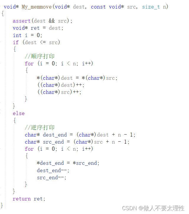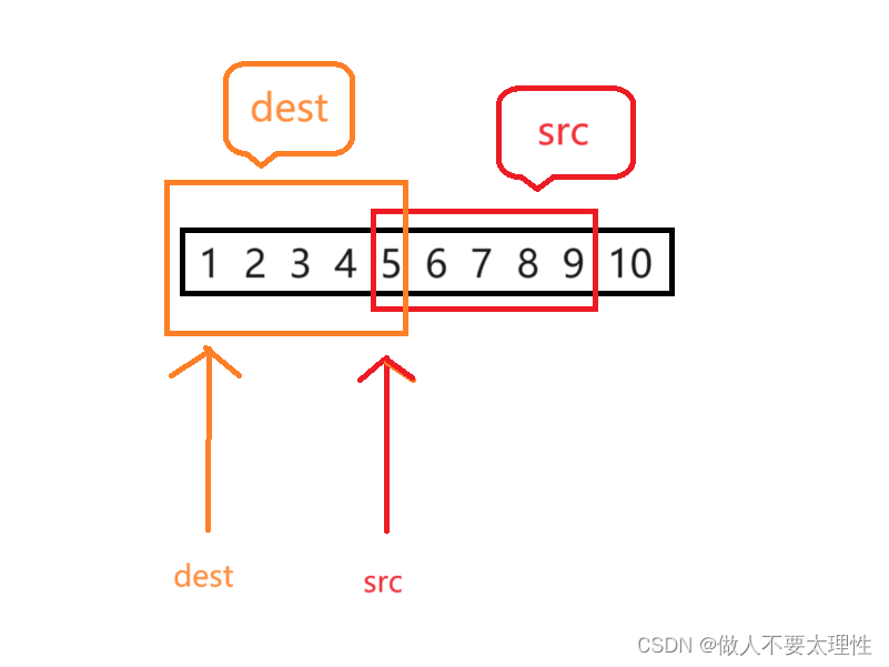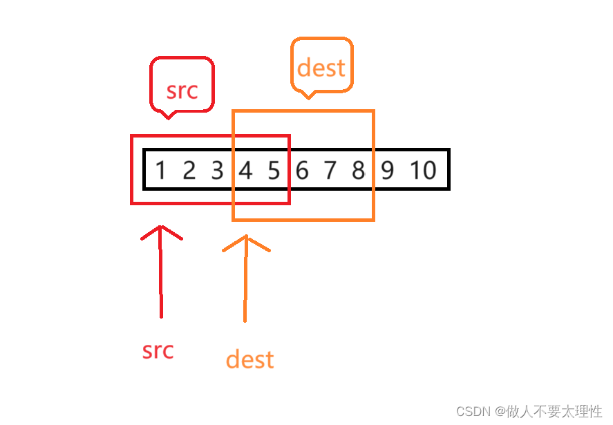 当dest <= src时,我们采取顺序打印(以src的视角)不然重叠的部分会被覆盖。