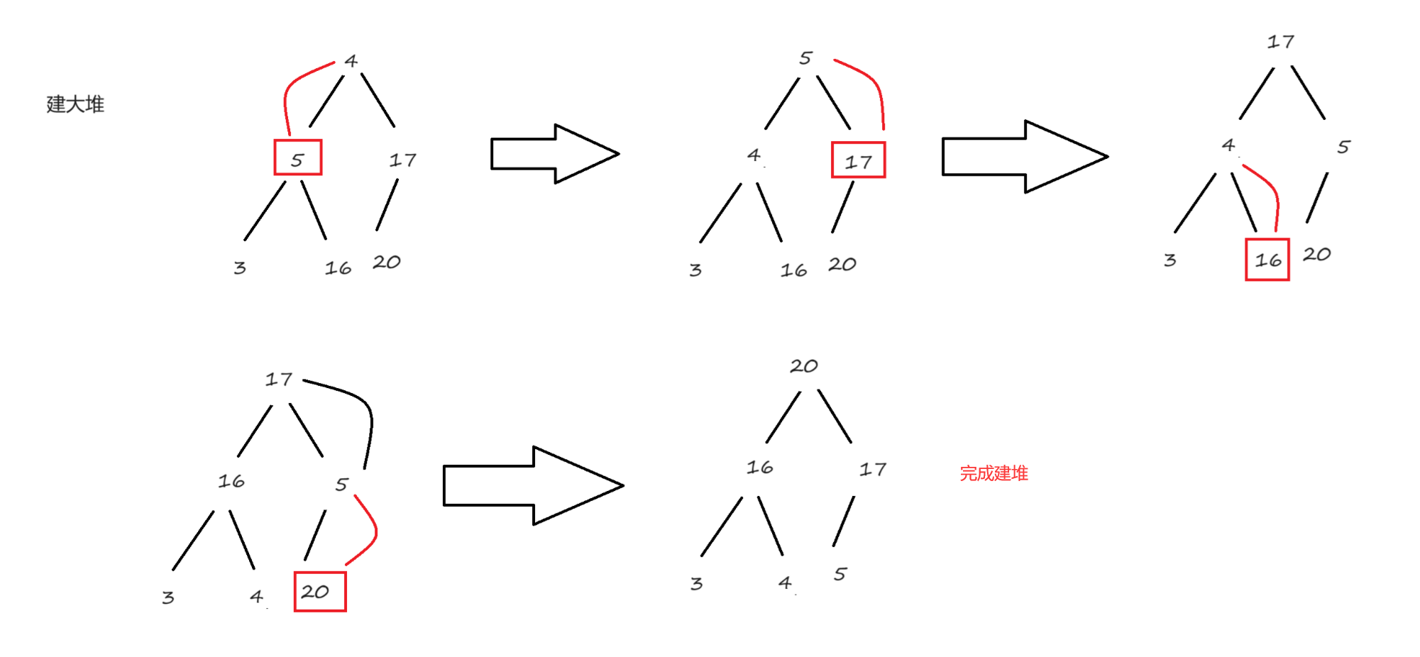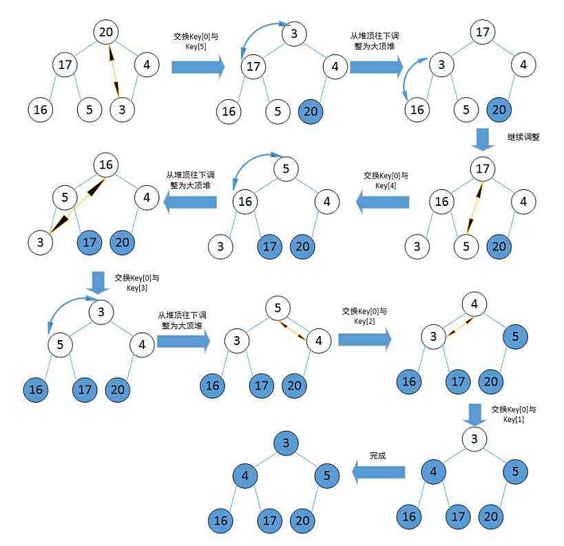 当数组建堆建好后,交换堆顶元素和最后一个元素,缩小堆的范围,向下重新调整堆,重复此过程,直到堆的大小为1,说明数组已经排序好了。