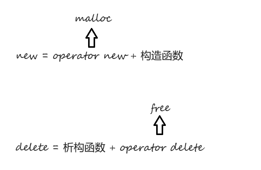 new会申请空间然后调用构造函数初始化,delete会先调用析构函数销毁资源然后再销毁空间。而malloc和free仅仅是申请空间和销毁空间。