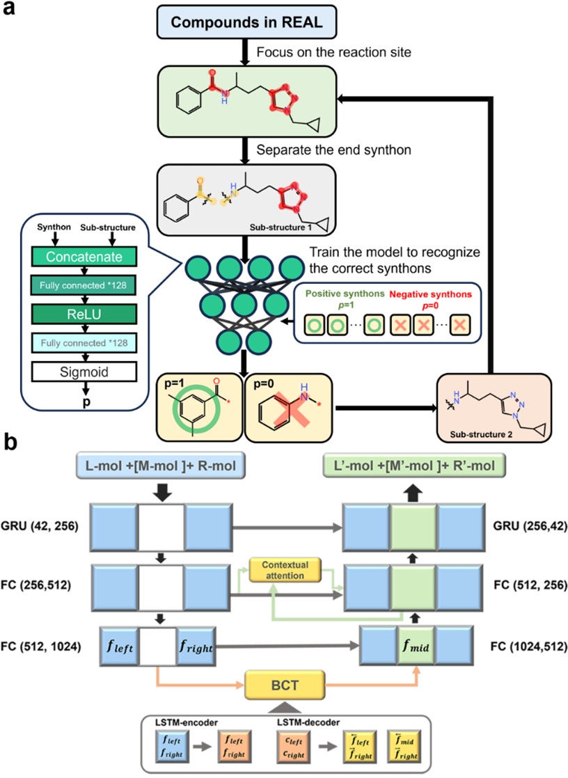 该文基于REAL数据集训练了一个化学反应组合器,此组合器能够根据数据集的可合成性和反应规则,通过组合合成子来组装分子。该组合器利用合成子或亚结构作为初始输入,从构件列表中选择合适的合成子。此生成器由一层128层全连接层、一个ReLU激活函数、另一128层全连接层,以及一个Sigmoid激活函数组成,输出一个被标记为p的结果,表示选择某个合成子的预测概率。在训练后,对于正确选择的合成子,模型输出接近1的p值,而对于错误选择的则接近0。主要的训练步骤如下,并在图1a中有所展示:(i) 确定分子是否含有可拆解的酰胺键和三唑环,并将其标记为反应位点。如果可拆解,则将两端的反应位点解析为合成子和亚结构,亚结构进入下一步。如果不可拆解,则终止该过程。(ii) 基于拆解位置,利用训练集构建一个包含n个兼容合成子(正样本)和N个不兼容合成子(负样本)的合成子数据库。兼容合成子被定义为与库中切割的合成子的Tanimoto相似系数大于0.7的合成子,不兼容合成子的相似系数则小于0.4。模型计算这些分子的损失值,然后返回步骤(i)以决定是否终止该过程。