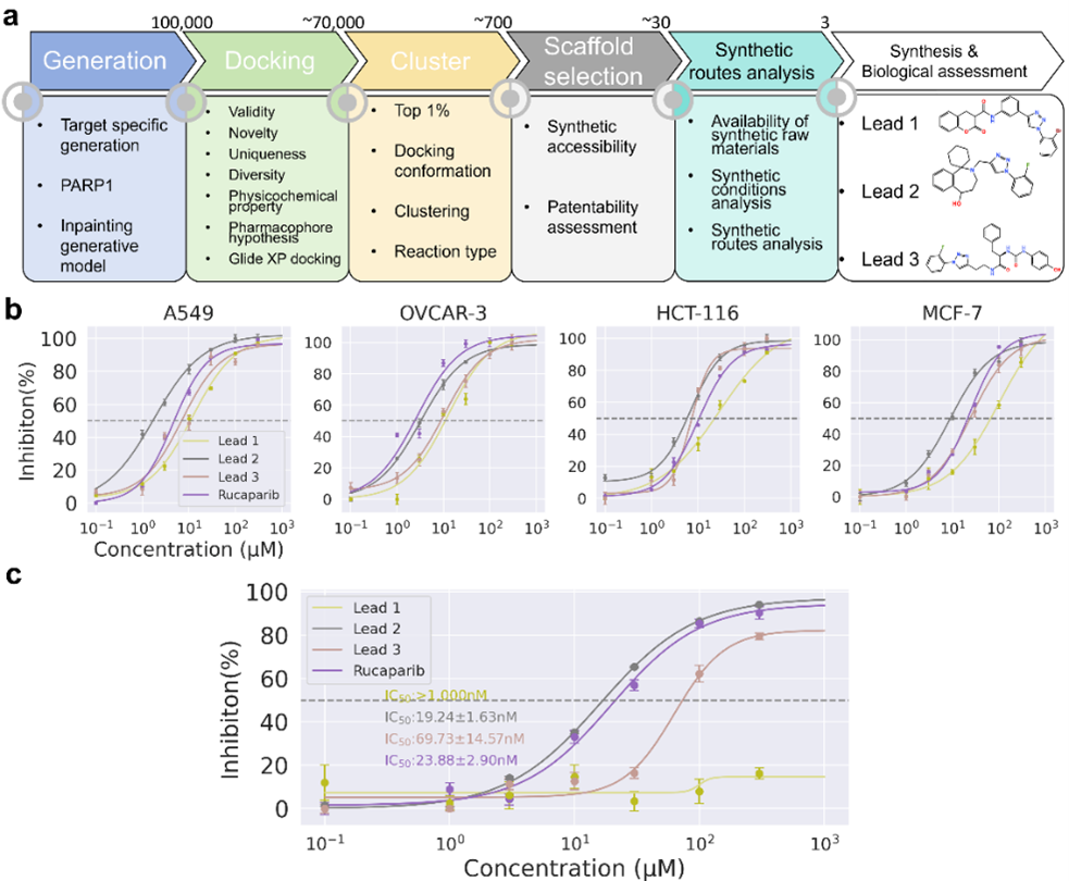 本文介绍一篇浙江大学药学院侯廷军教授、谢昌谕教授以及碳硅智慧联合于在《Nature Communications》上发表的分子生成新方法的论文。该论文提出了一种基于生成式AI的全新药物设计模型ClickGen,该模型能够利用模块化反应(如点击化学)组装分子,并结合强化学习和图像补全技术,确保生成的分子具备高度的多样性、新颖性、靶标高亲和性以及优秀的可合成性。此外,本文还针对ClickGen生成的多聚腺苷二磷酸-核糖聚合酶1(PARP1)配体分子进行了实验验证。由于该模型确保了生成分子的高合成性,并提供了合成路线参考,仅20天内便成功合成并测试了这些新化合物的体外生物活性。在生物活性实验中,两个先导化合物表现出对癌细胞株抗增殖效果、对正常细胞的低毒性,以及对PARP1酶的纳摩尔级抑制活性。该方法有望使得基于AI的自动化实验和分子设计的闭环更进一步。