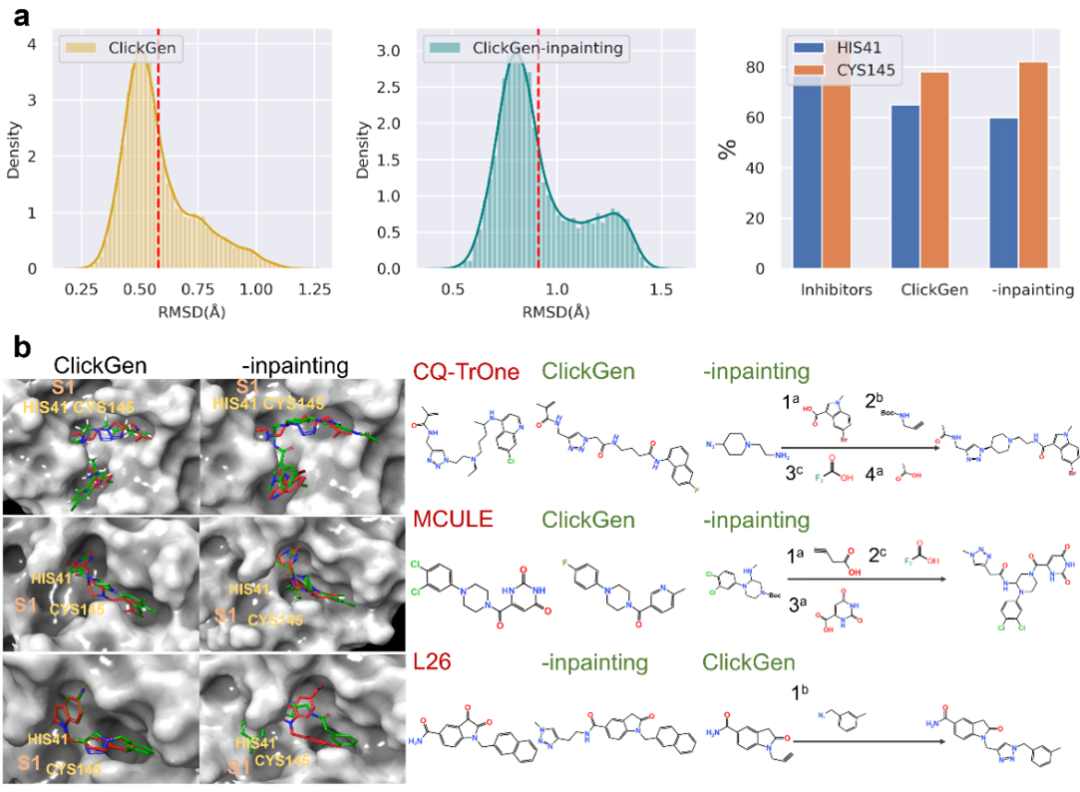 本研究首先将所有生成的分子与蛋白重新对接,并使用具有最高Tanimoto相似性的活性分子作为模板。这种方法能够获得生成分子的“理想”结合构象,然后通过RMSD(均方根偏差)计算,将其与生成的分子构象进行比较。在图4a中,前两个图显示了两个ClickGen模型生成的分子与理想结合构象的RMSD构象均值均小于1 Å,这表明这两个模型都能够生成具有理想结合构象的分子。此外,使用inpainting模型时,观察到构象偏差增加,平均RMSD从约0.6 Å增至0.9 Å。然而,在第三个图中可以看到,ClickGen-inpainting模型仍然与S1区域的HIS41和CYS145残基保持相互作用。这两种氨基酸残基在SARS-Cov2抑制剂的设计中至关重要,ClickGen模型中也观察到了这一结果。通过对这些对接分子的蛋白-配体相互作用深入分析,发现尽管与这两个氨基酸的总体相互作用相似,但在特定相互作用上存在显著差异。ClickGen-inpainting模型与HIS41的相互作用更接近于抑制剂,而ClickGen模型则表现出更多疏水相互作用和较少的氢键相互作用。相反,对于CYS145,ClickGen模型更匹配抑制剂的相互作用,而ClickGen-补全模型则表现出较少的氢键相互作用。