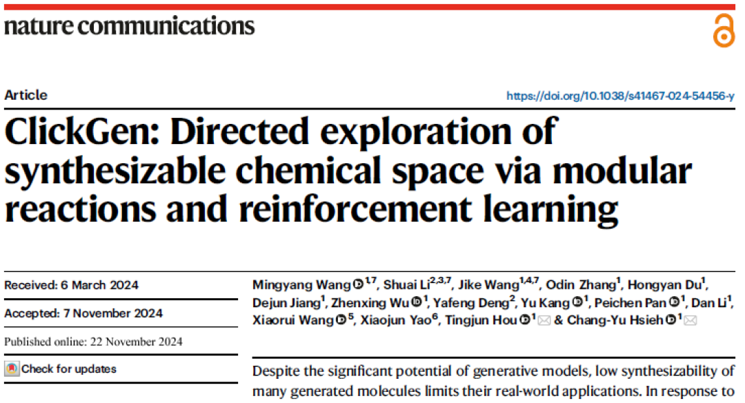 Wang, M., Li, S., Wang, J. et al. ClickGen: Directed exploration of synthesizable chemical space via modular reactions and reinforcement learning. Nat Commun 15, 10127 (2024).