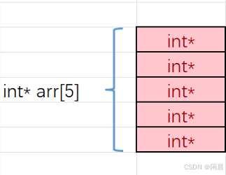 指针数组的写法,它可以是整形,也可以是字符类型,int* arr[5]; char* arr[5];
