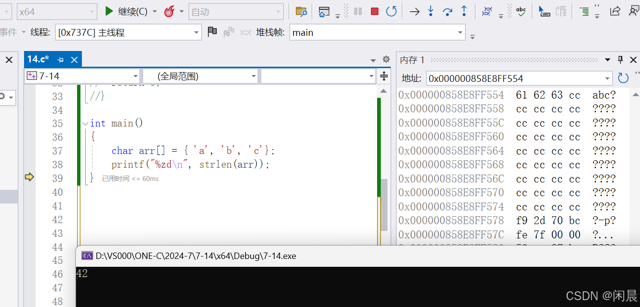 这里通过调试功能也发现,在内存1里,从61(字符a的十六进制ASCII码值)开始数数,一值数到 fe 7f 00 00这一行,00之前的确有42的字符。