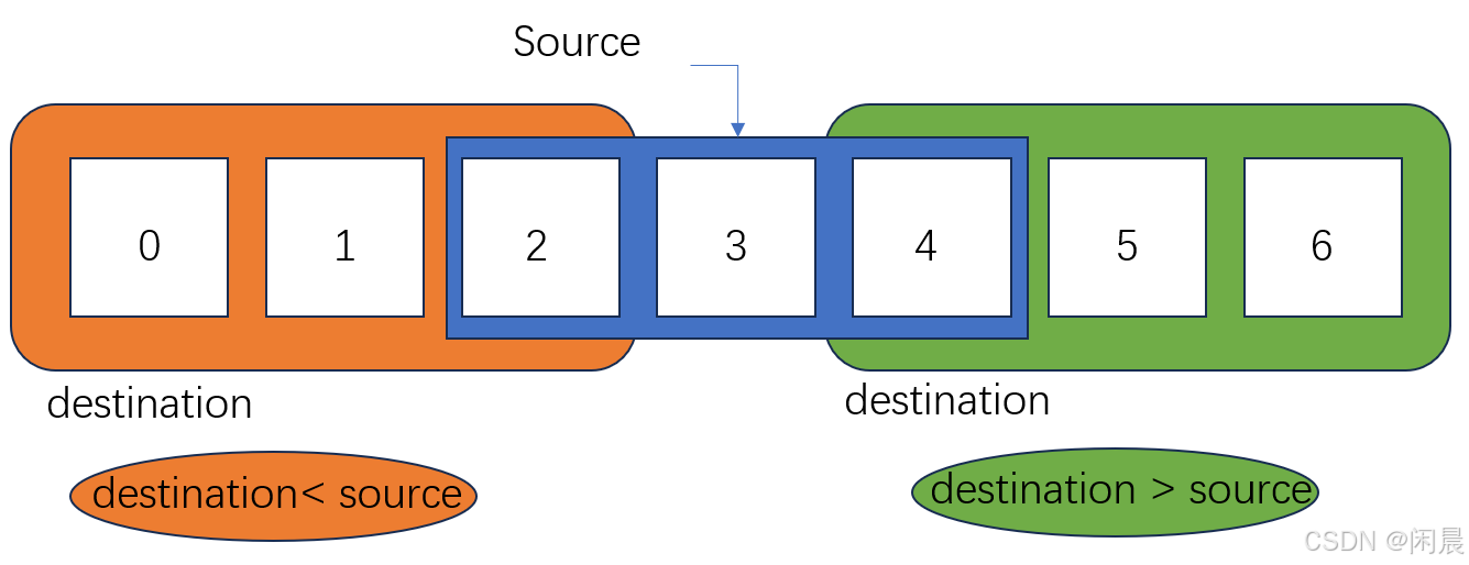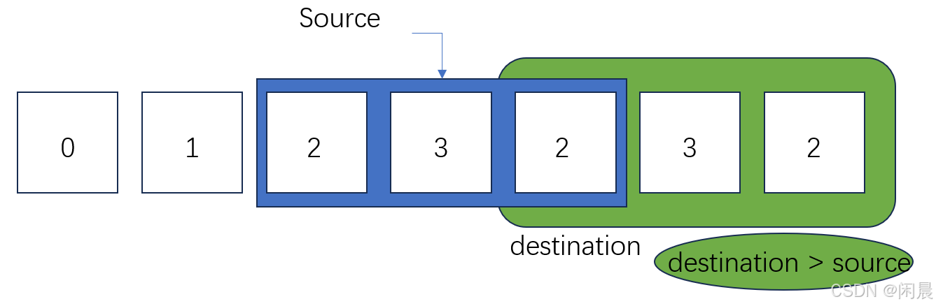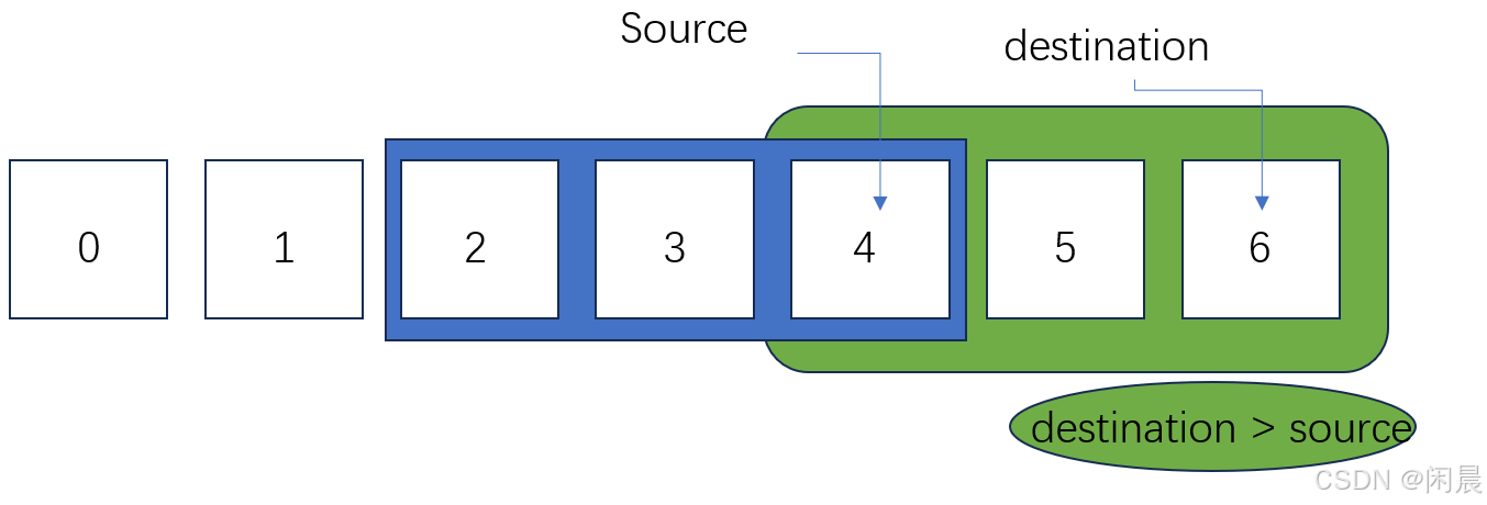 可以发现,使用从前向后一起拷贝字节时,源空间的内容覆盖掉,它还没有拷贝就已经被覆盖了,并将其放置在目标空间的最后一个位置。解决这种办法也很好理解,既然从前向后拷贝不行,那我们从后向前拷贝不久可以了。这样就避免了,还没有将源空间的数据拷贝到目标空间就被覆盖的情况。