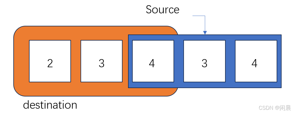 void* memmove(void* destination, const void* source, size_t num);俩个函数的功能及其相似,它们在实现上的不同,模拟memcpy函数是,对字节进行拷贝时,是将source里的字节从前向后一个一个拷贝的,如图: