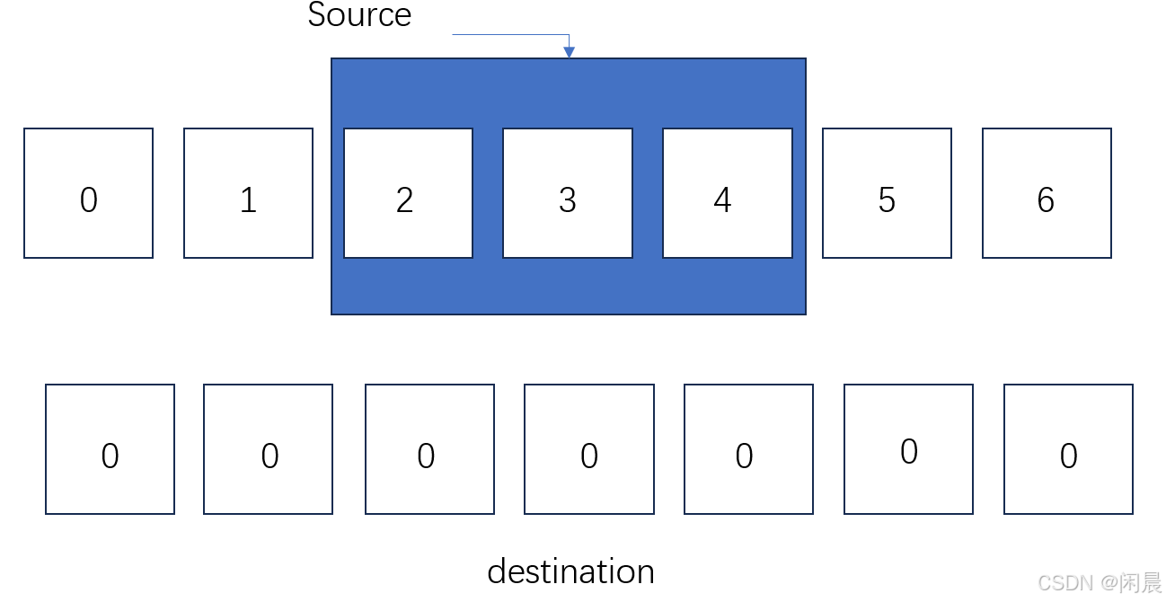 source里一共有12个字节,模拟的memcpy函数将从数字2开始的第一个字节,一个一个拷贝到目标空间里。