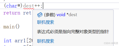 c/c++里的强制类型转换,是临时的,(char*)dest++;试图将一个 void *类型的dest强制类型转换,然后++,语法是有问题的,对 (char *)dest使用++,实际上是 (char* dest) = dest + 1;,将无符号类型的指针赋给 char *类型的指针编译器会报错的