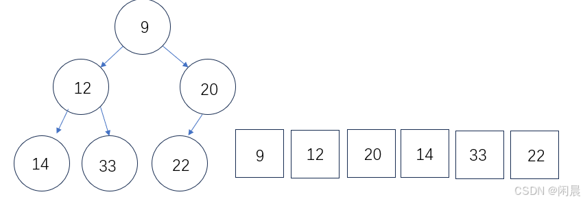 现在想要在堆里放入一个数据,不能是我想在哪放就在哪放的,必须先将节点20的右孩子节点放入数据,才能到下一层放入数据。这些严格的要求也导致了用数组实现堆,存放数据也是从末尾开始。