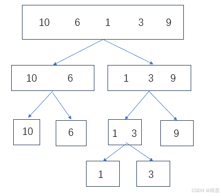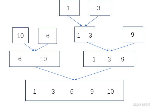 1 31 3和 9合并为 一个有序序列,1 3 96 106 10和 1 3 9合并为一个有序序列,1 3 6 9 10,排序完成。