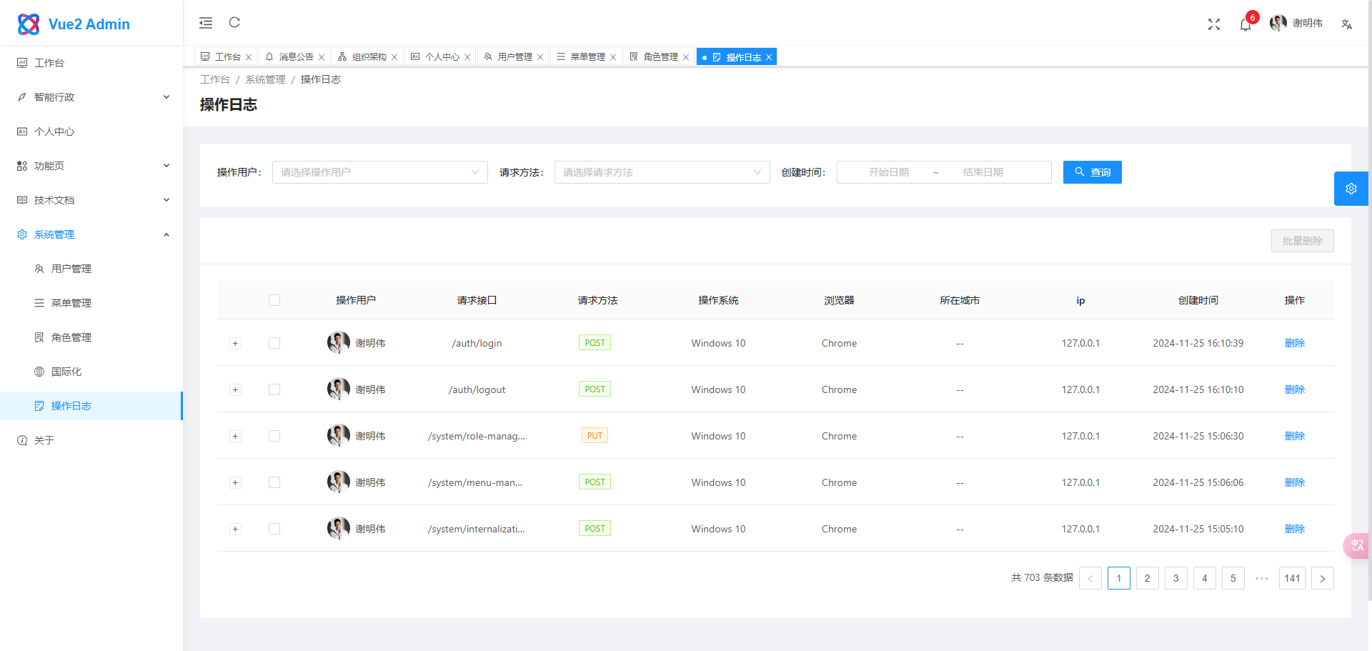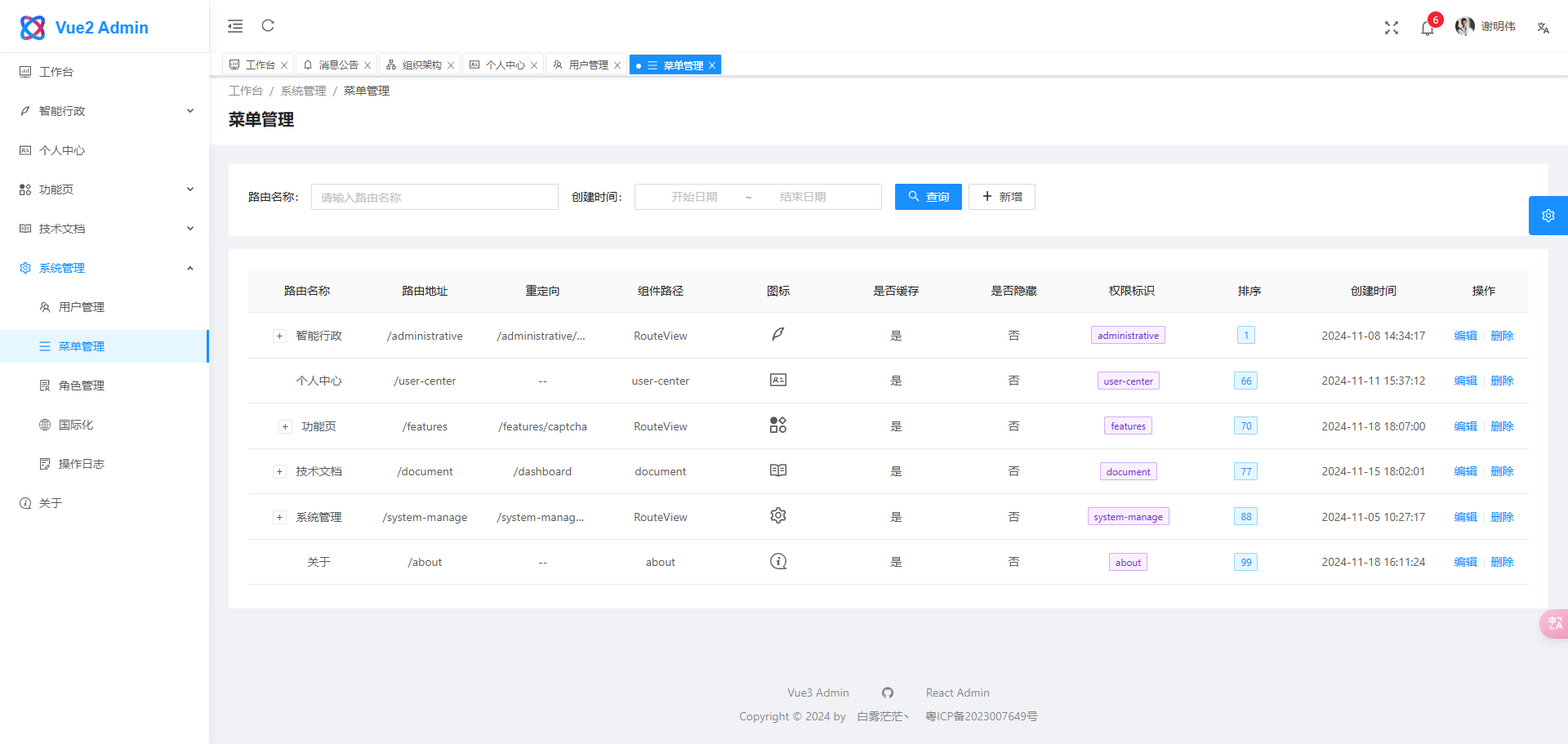 pnpm buildweb/src/views 目录下新建 文件夹/index.vue 文件系统管理-国际化-menu 中添加路由配置系统管理-菜单管理 中按照规则添加菜单,可打开多个标签页参考,路由配置参考:路由和菜单系统管理-角色管理 中编辑状态中勾选相应的菜单,保存刷新页面,即可看到路由菜单生效- 登录 / 注销