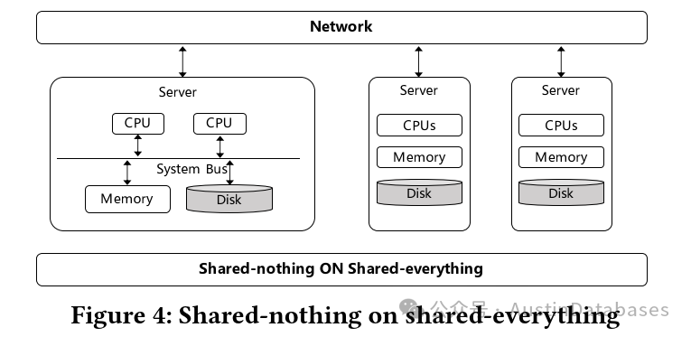 如图 4 所示,物理集群既不是完全shared-nothing,也不是完全shared-everything。每台机器上的单个节点都是多处理器结构,具有大量的 CPU 以及强大的存储和计算能力。在对单机和集中式数据库进行扩展时,不应忽视这些功能,而应将其视为一个需要考虑的部分。分布式数据库应同时考虑水平扩展和垂直扩展。