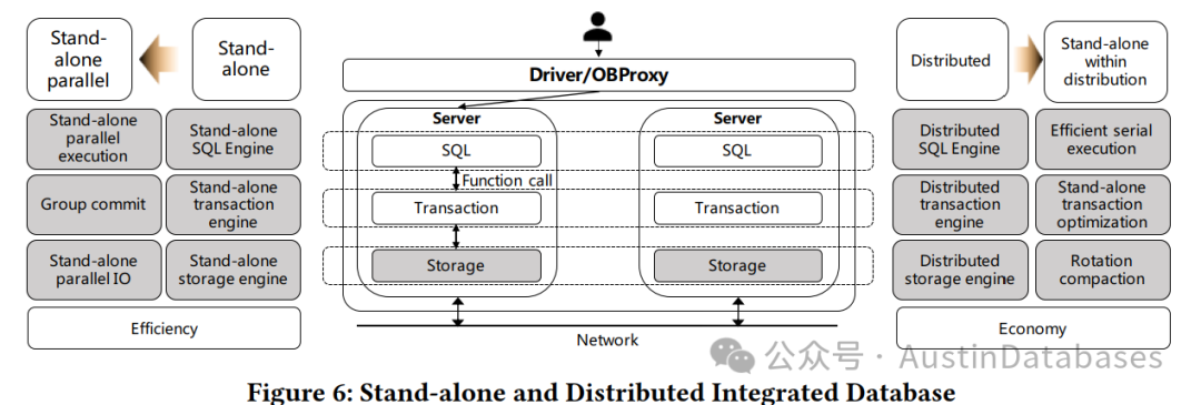 如图 5 右侧所示,如果将这个分布式数据库以一种非常简单的方式插入到一个节点中,并以单机方式运行,就会发现最大的问题。在单台机器上工作时,这些组件之间的交互成本非常高。对于像 MySQL 这样的单机数据库来说,这种开销本质上是一种额外的不必要的开销,因此很明显,这种简单的方法很难与单机数据库相提并论。