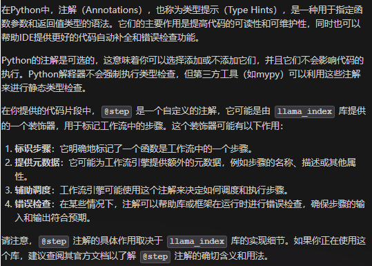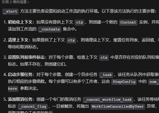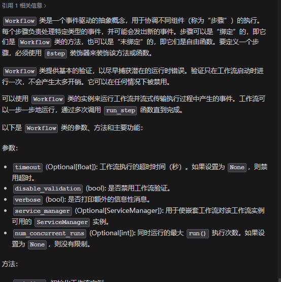 以前一直在阅读Spring的源码,深知要独立阅读并理解Spring的复杂代码是多么困难。当时,如果没有借助网络搜索的帮助,仅凭自己的时间和精力,根本无法完成对Spring源码的深入理解。今天,借助AI助手可以更加高效地了解llamaindex中关于workflow的工作原理。我之前已经编写过一个简单的llamaindex示例Demo,对其结构和使用方法有了一定的了解,因此示例Demo理解起来并不困难。与Java相比,llamaindex框架的封装非常精妙,几乎可以实现一键启动,免去了许多繁琐的配置和操作。