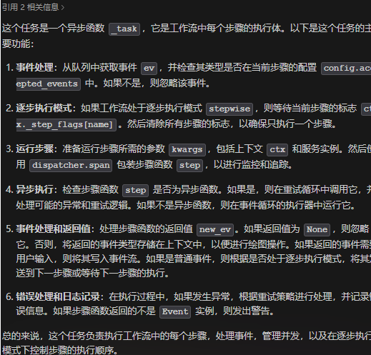 总的来说,深入理解LlamaIndex中关于workflow的工作原理让我们更清楚地看到了这个框架的高效和灵活性。通过对Event、Step、Workflow等核心类的分析,我们可以发现,LlamaIndex的设计思想与传统框架相比,确实更加简洁和模块化,尤其是在任务的处理和事件的传播方面,它将复杂的操作抽象化,使得开发者能够专注于业务逻辑的实现,而无需过多关注底层细节。