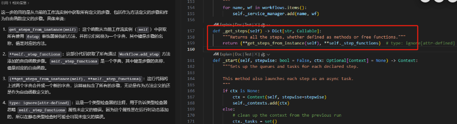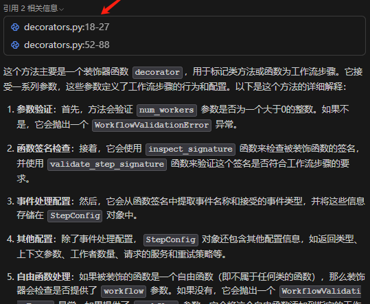 没有说的很清楚,我们可以直接根据提示进入到step装饰类中查看具体内容,以便AI助手进行准确的回答。我们可以选择性地将相关的代码片段提供给AI助手,以帮助其更好地理解上下文并给出有效的支持。