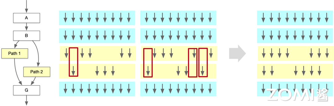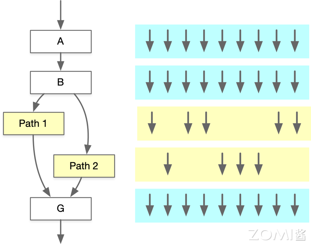 当存在 Path 1 和 Path 2 两条路径的时候,由于某些时钟周期为空,因此在动态合并分支之后执行相同指令的线程,以便同时执行不同的代码路径,从而避免线程之间的等待和资源浪费。