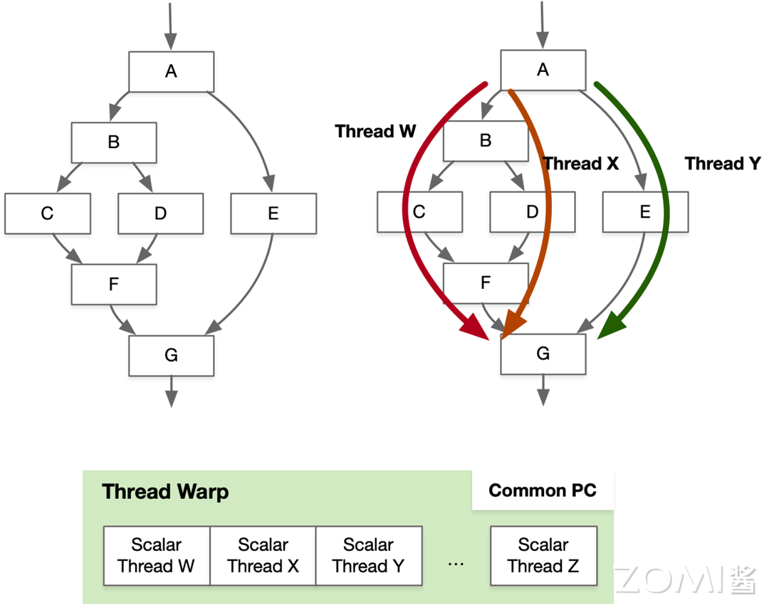 英伟达 GPU 可以使线程在 Warp-base SIMD 上执行不同的分支,每个线程都可以执行带条件控制流指令(Conditional Control Flow Instructions),同时不同线程间可以分别执行不同的控制流路径(Different Control Flow Paths),比如分别执行不同的 Thread W,Thread X 和 Thread Y 控制流执行路径。