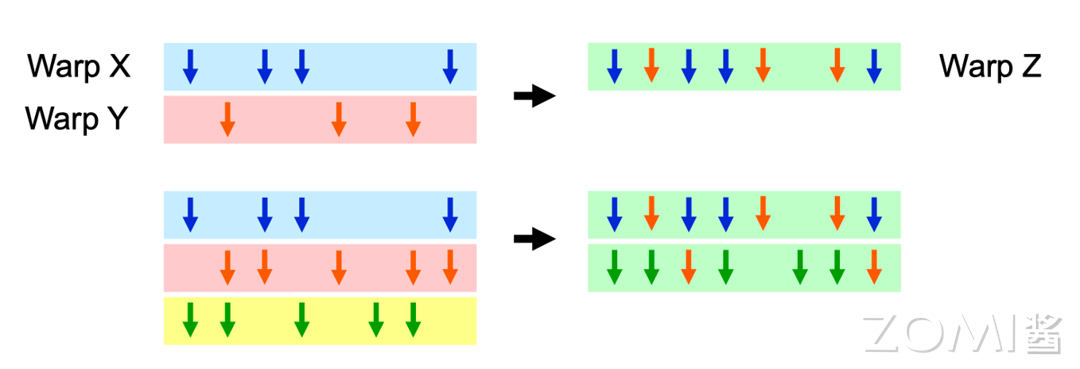 为了解决分支预测的问题,动态 Warp Formating/Merging 在分支后动态合并执行相同指令的线程,从正在等待的 Warps 中形成新的 Warps,分支下每条路径线程用于创建新的 Warp。可以将 Warp X 和 Warp Y 合并为 Warp Z,从而更好地执行相同指令。