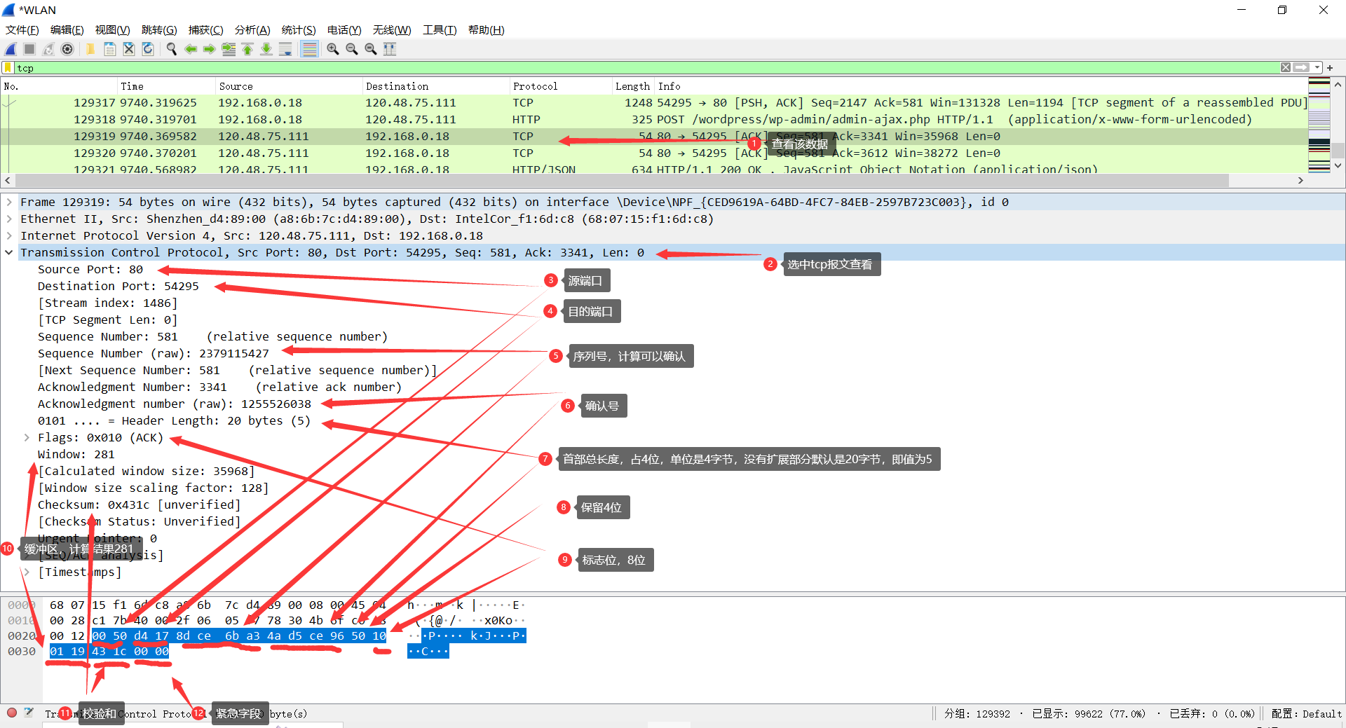 从下图可以看到wireshark捕获到的TCP包中的每个字段。